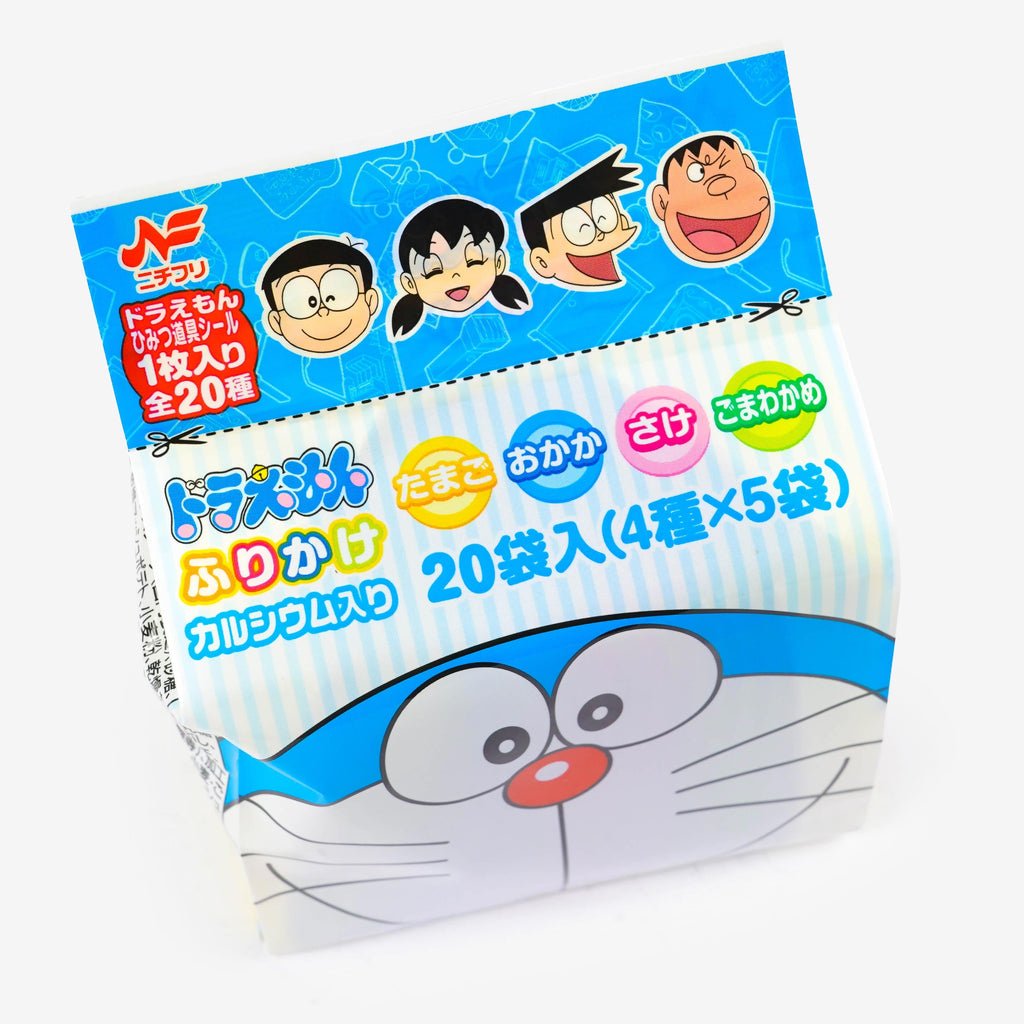 A bag of Japanese all-purpose seasoning pouches with various flavors featuring Doraemon