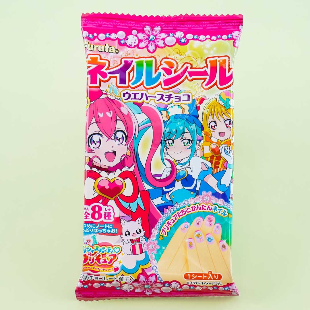 Have a bite of a delicious wafer with your cute Pretty Cure friends! The package includes a deliciously thin wafer with chocolate filling and PreCure nail stickers! There's a total of 8 different kind of magical PreCure nail stickers so it's always exciting to open the package and see which one you'll get. Decorate your nail with cute ladies of Pretty Cure and collect all the stickers while enjoying the sweet chocolate wafer! Yum!