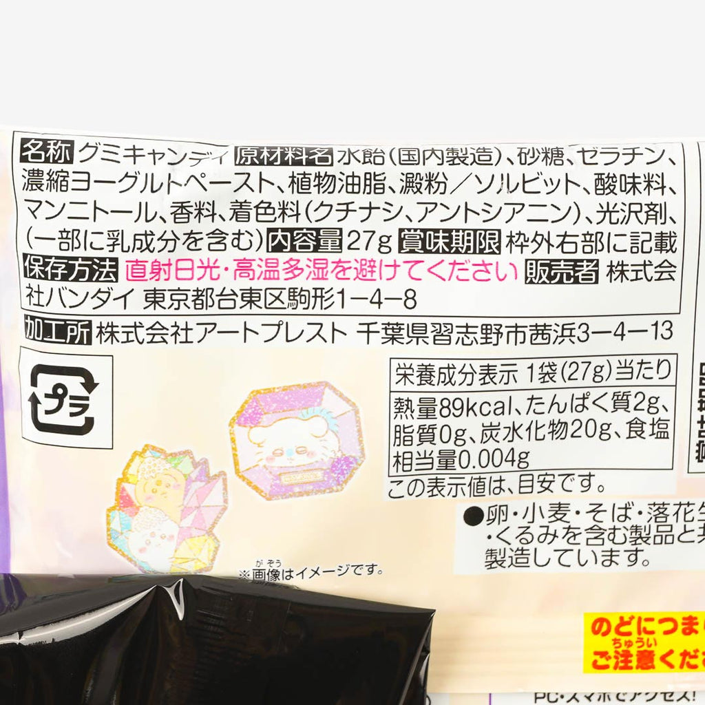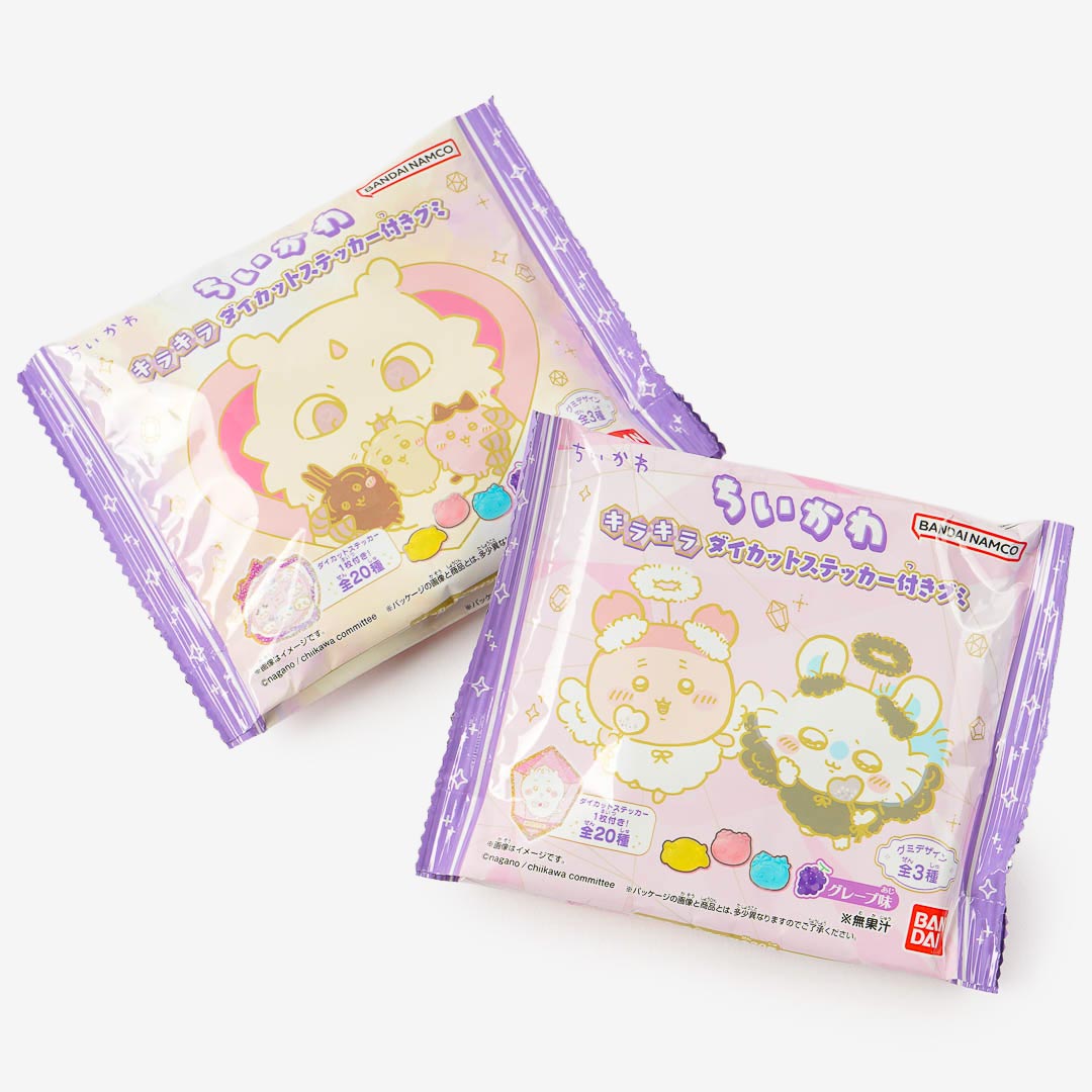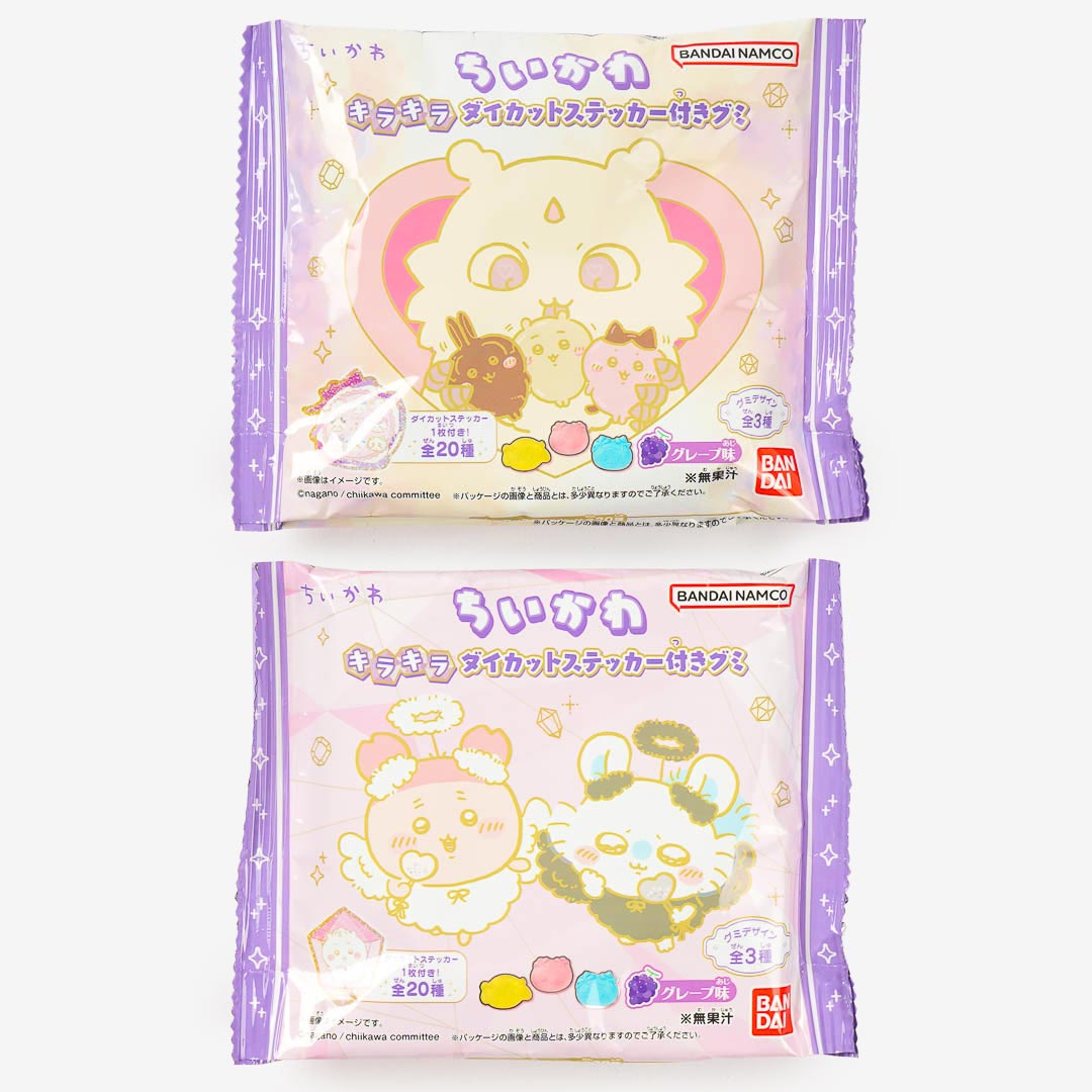 Enjoy grape-flavored gummies shaped like Chiikawa, Hachiware, and Usagi! This pack also includes a cute glittery die-cut sticker featuring the Chiikawa characters. Collect one of 20 different designs!