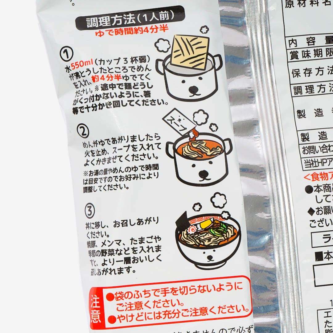 This ramen comes in a package featuring Pirika, a polar bear from Sapporo Maruyama Zoo! Inside is a delicious shio (salt) ramen packed with aromatic vegetable flavor! The noodles are slowly aged and dried for two days, giving them a firm texture and rich wheat flavor. Enjoy a bowl of this ramen noodles on a cold, rainy day!