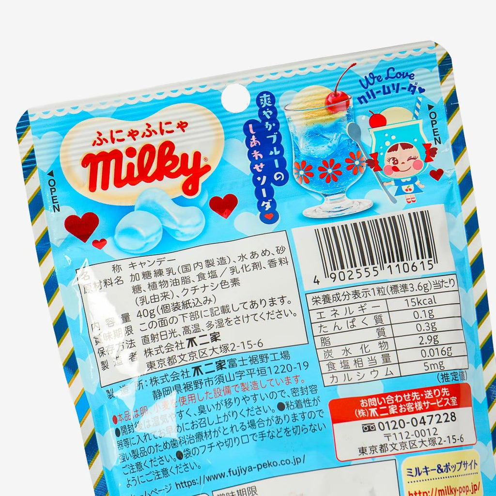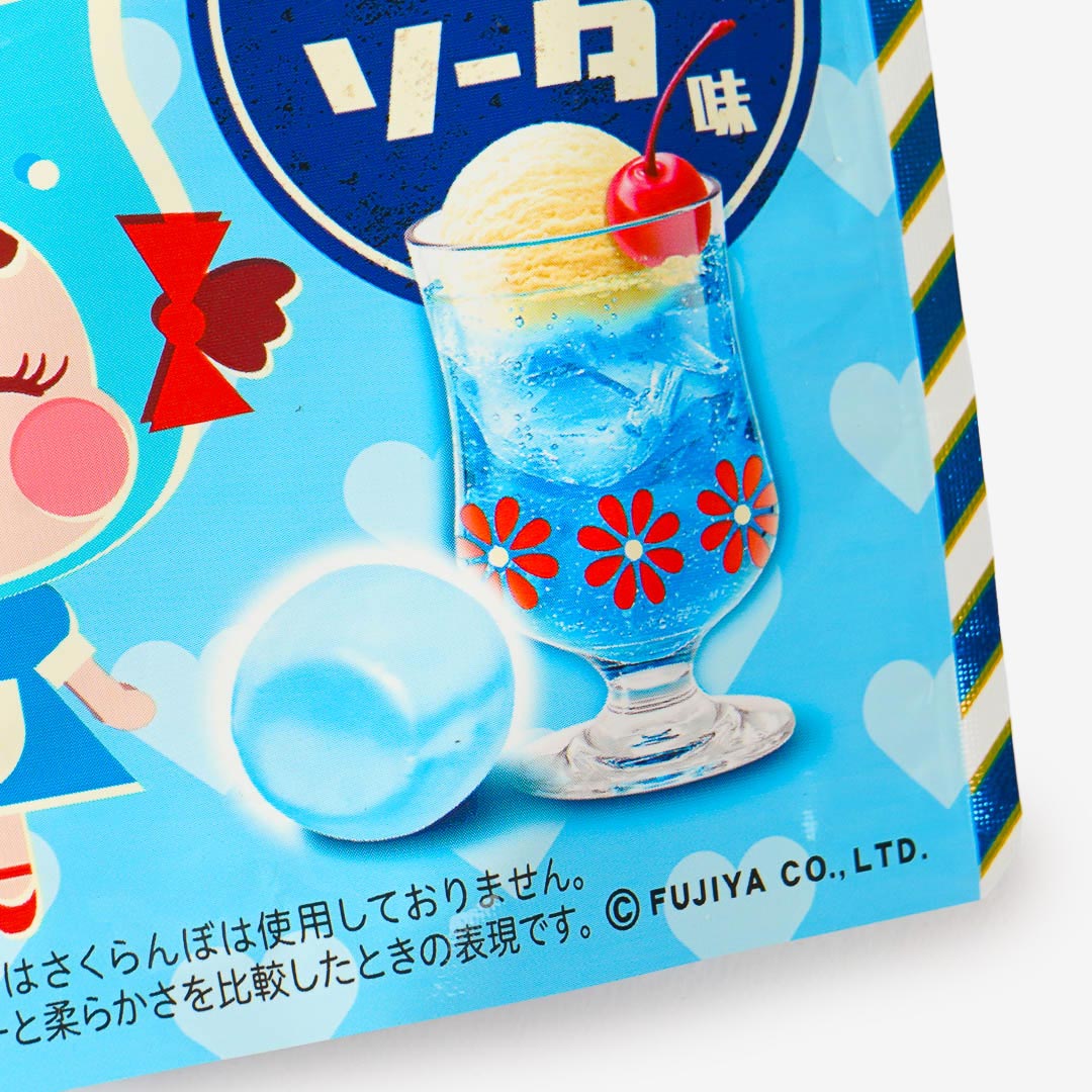 Have fun munching on these soft and chewy candy! It has a milky and fizzy taste inspired by the classic blue cream soda. The cute retro-style packaging features Peko-chan dressed like a soda!