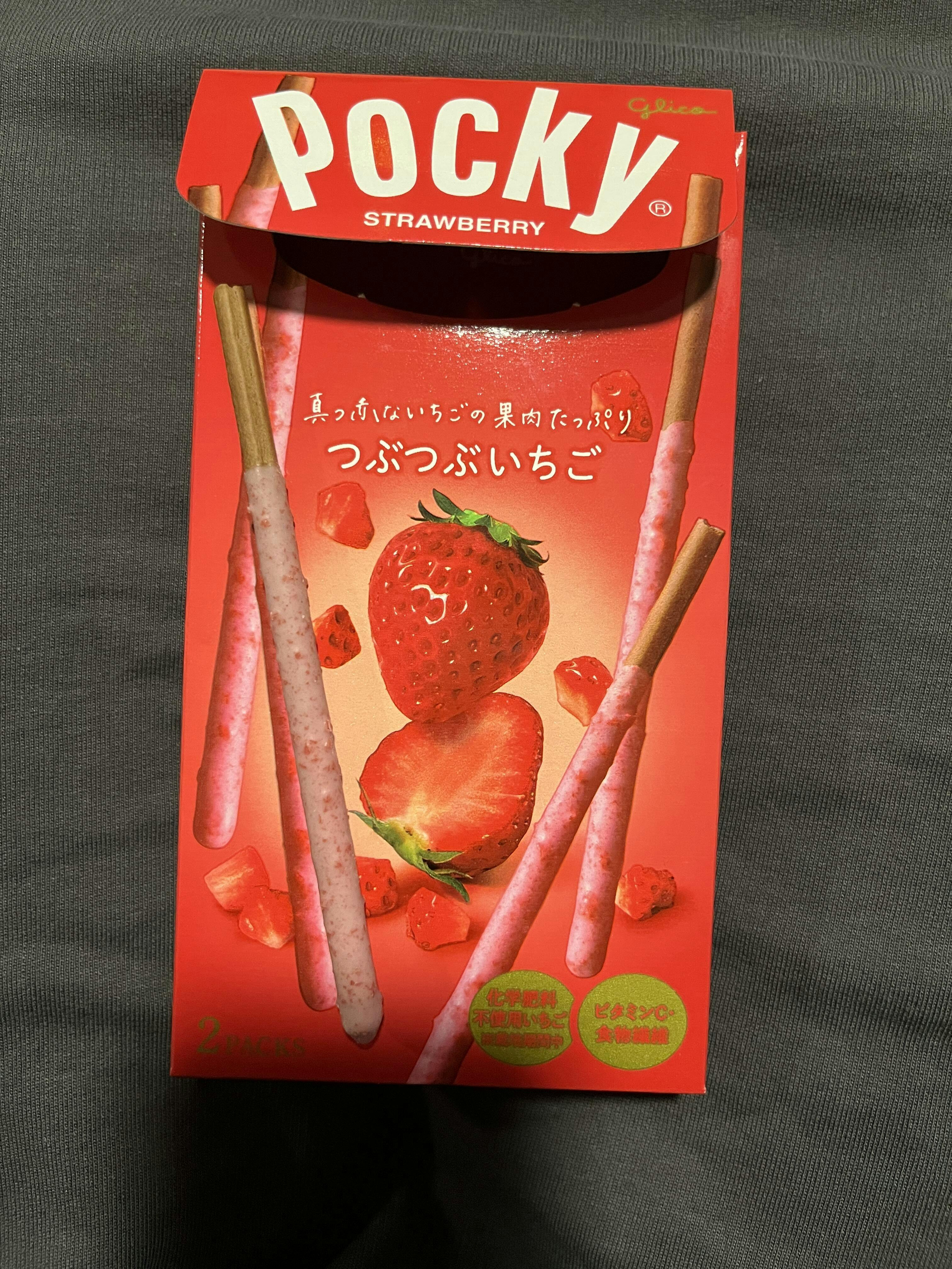 Pocky are light stick shaped biscuits covered in chocolate and get their name from their "pocky" sounding crunch. For this special flavor, the chocolate biscuits are coated in creamy strawberry chocolate made with actual strawberry bits. The end of the sticks has been left uncoated, so you will not get your fingers sticky while enjoying this sweet treat!