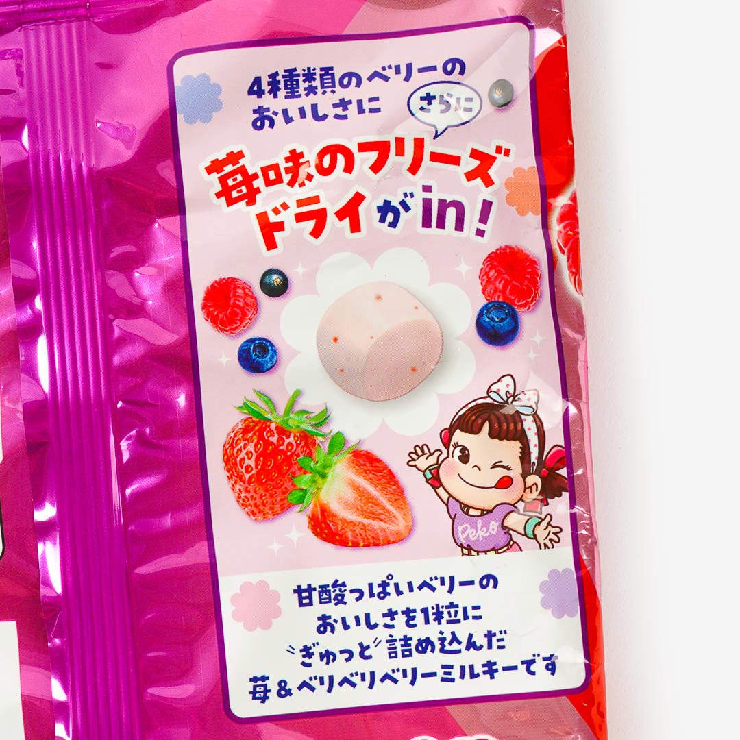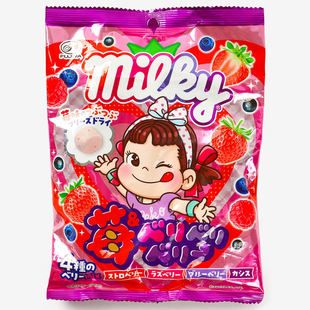 This chewy berry milk candy adds a fun twist to the classic Milky treat! It features four fruity flavors—strawberry, raspberry, blueberry, and blackcurrant. Each piece is packed real freeze-dried strawberry bits for extra flavor and texture!