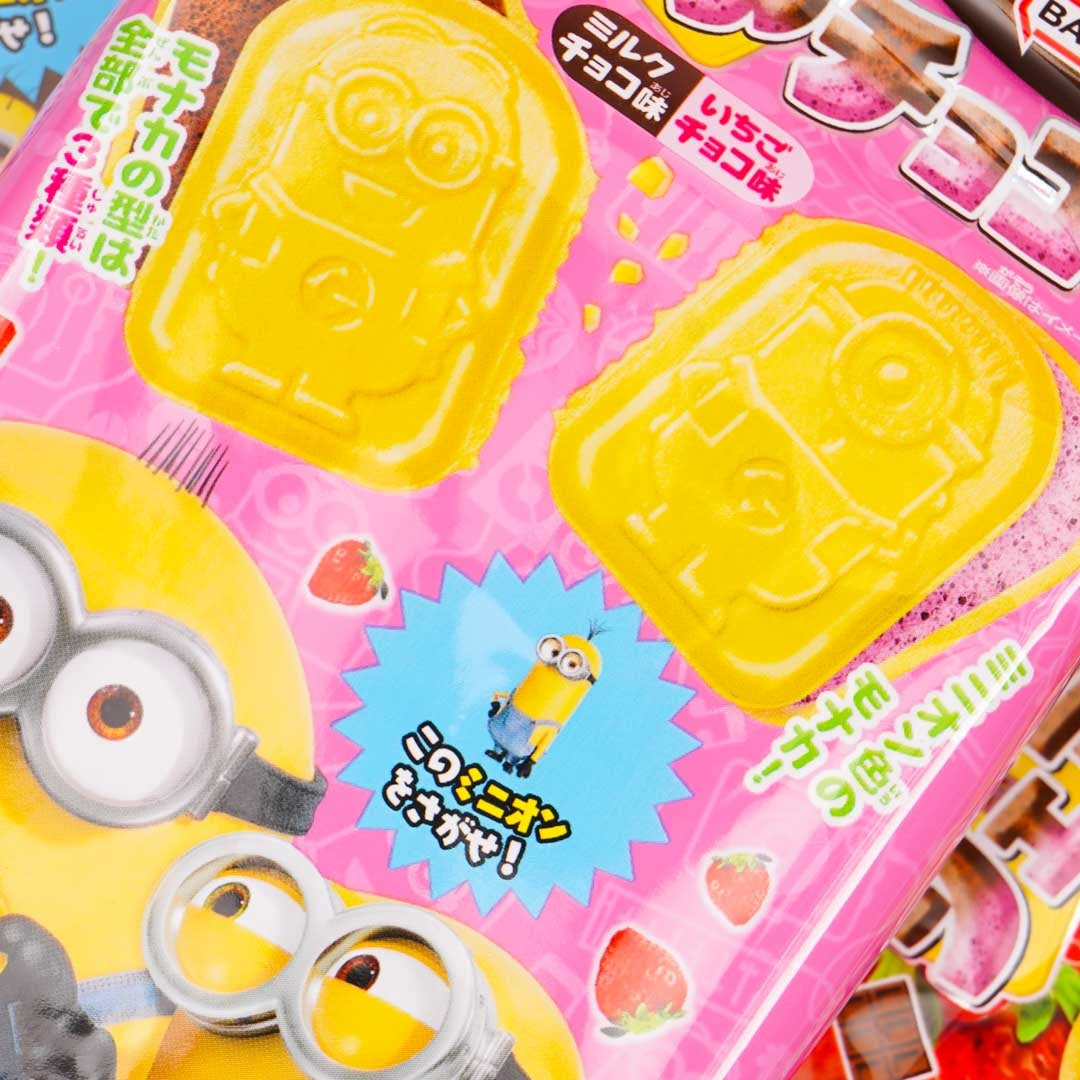 This pack of Minion-shaped monaka or Japanese wafer treats is perfect for snacking! Each wafer treat is filled with air-in chocolate. Enjoy the two different flavors in the pack - mellow milk chocolate and refreshing strawberry. You'll get random minion wafer designs and random packaging designs selected from a set of 3 when you order.