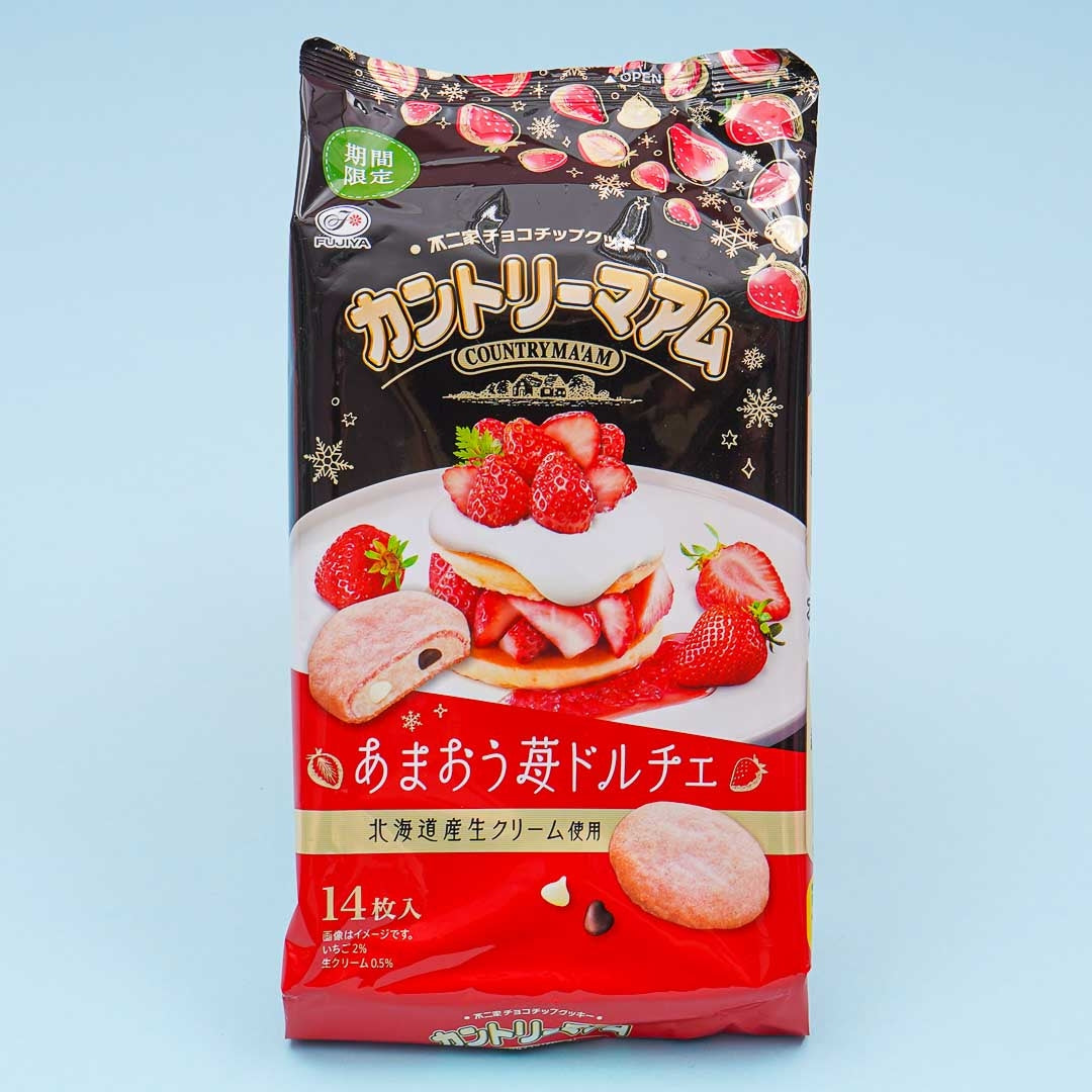 Indulge in this seasonal pack of Japanese cookies inspired by the luxurious flavor of the Amaou Strawberry Dolce cake. These limited-edition cookies combine Amaou strawberry juice, cream made in Hokkaido, and two kinds of chocolate chips. It's the perfect treat!