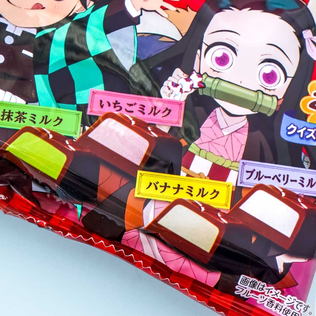 Share this pack of chocolate bites with your friends! This special pack was created in collaboration with the popular animé series, Demon Slayer: Kimetsu No Yaiba for the seventieth anniversary of Milky chocolate. The sweet treats come in individual mini wrappers with random character print out of twenty-four possible designs. Each piece is filled with either matcha milk cream, strawberry milk cream, banana milk cream, or blueberry milk cream! Surprise yourself as youll get a random pack illustration out of two possible designs.