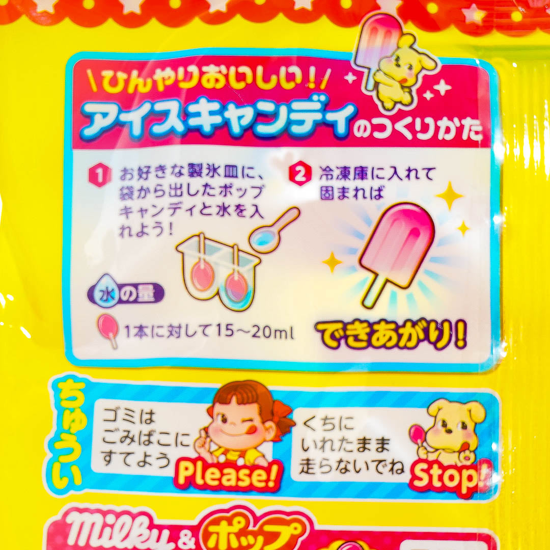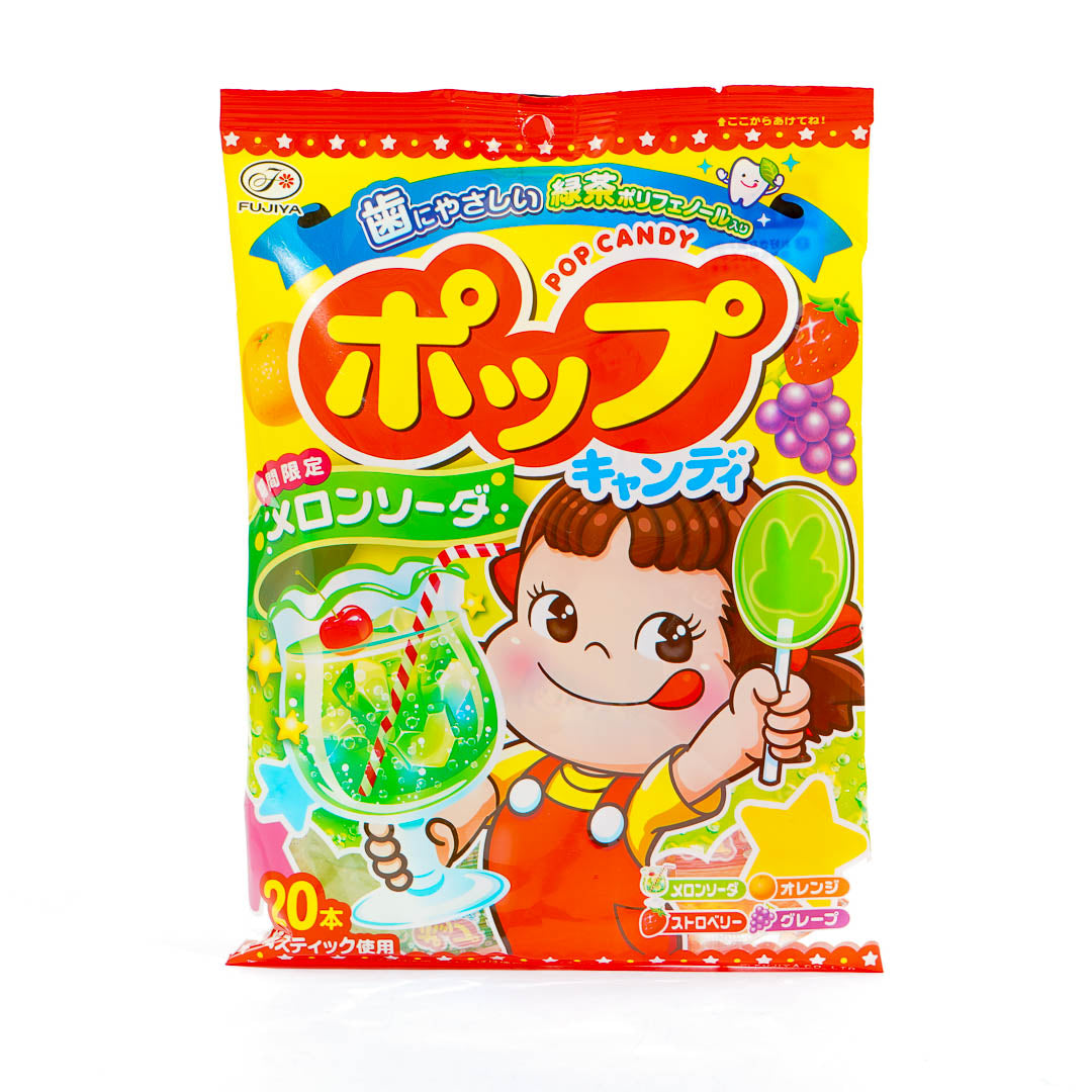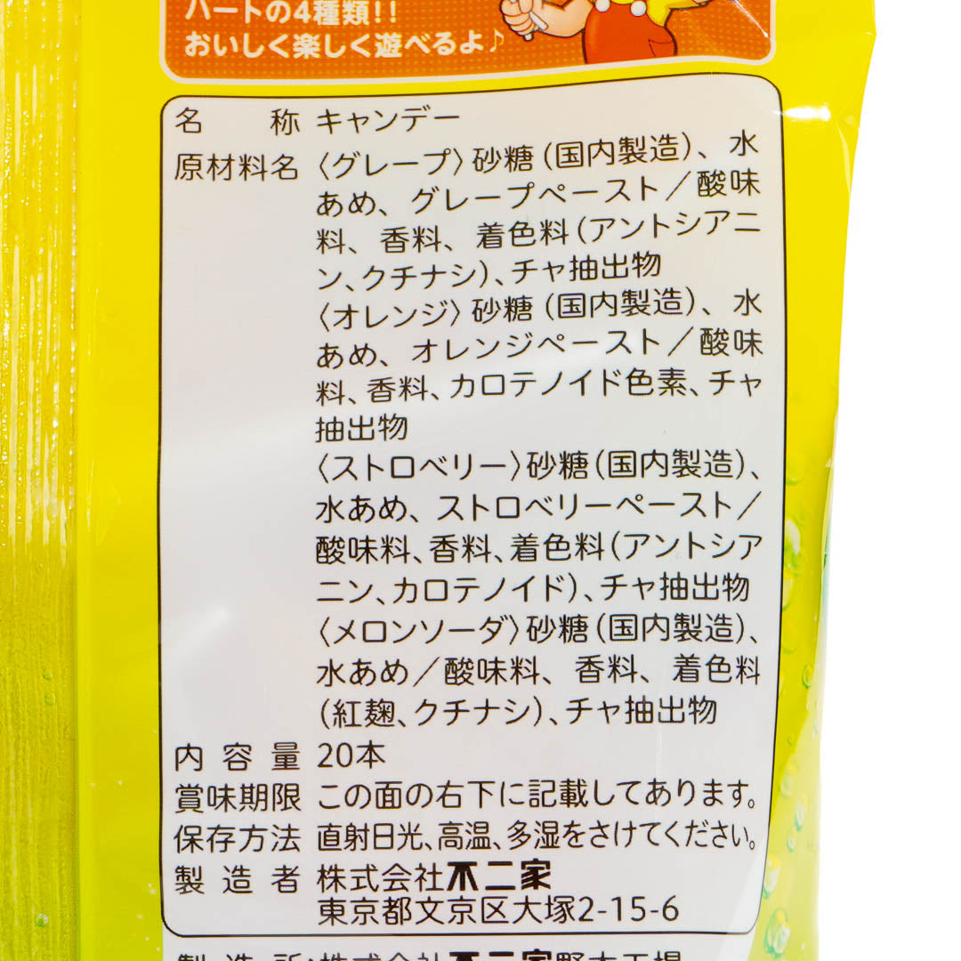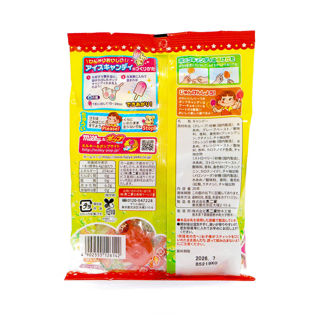 This pack of yummy lollipops features prints of Peko-chan! Enjoy all the different fruit flavors in the pack including grape, orange, strawberry, and the limited-time flavor, soda!