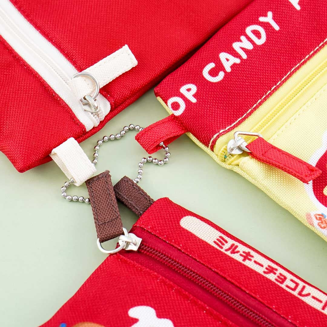 Organize your hair clips, charms, and other knick-knacks using this super cute set of pouches. Each pouch features prints of Peko-chan, the mascot of Japan's popular Milky candy. These zippered pouches have three different sizes so you can use them for different things. The set comes with a detachable ball chain to keep them all together.