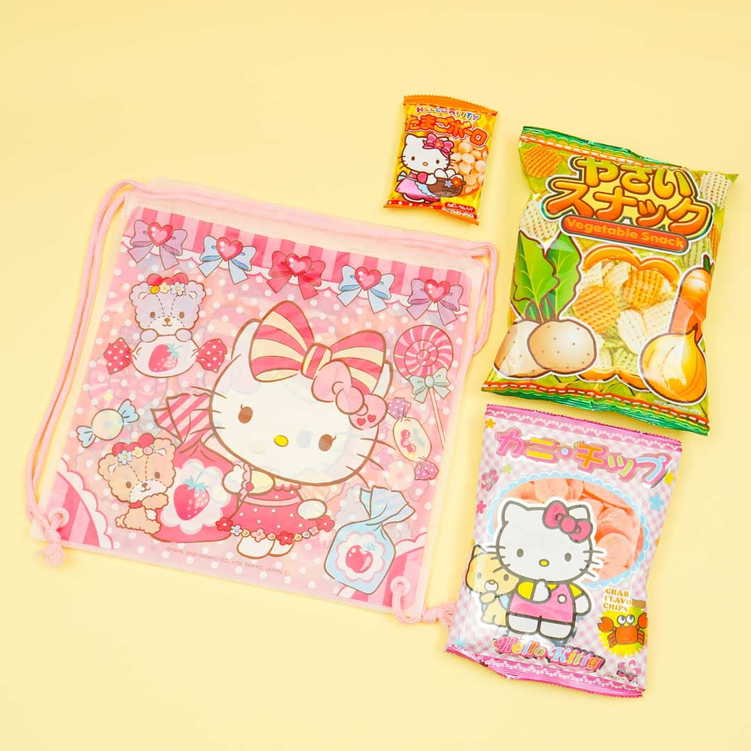 Use this super kawaii drawstring pouch to store your trinkets! It features prints of Hello Kitty. Inside is three different packs of snacks showcasing Hello Kitty prints.