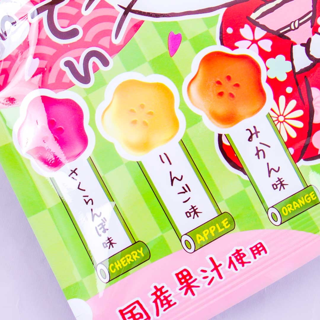 • A pack of flower-shaped cherry, apple, and orange-flavored candies featuring Hello Kitty in a kimono