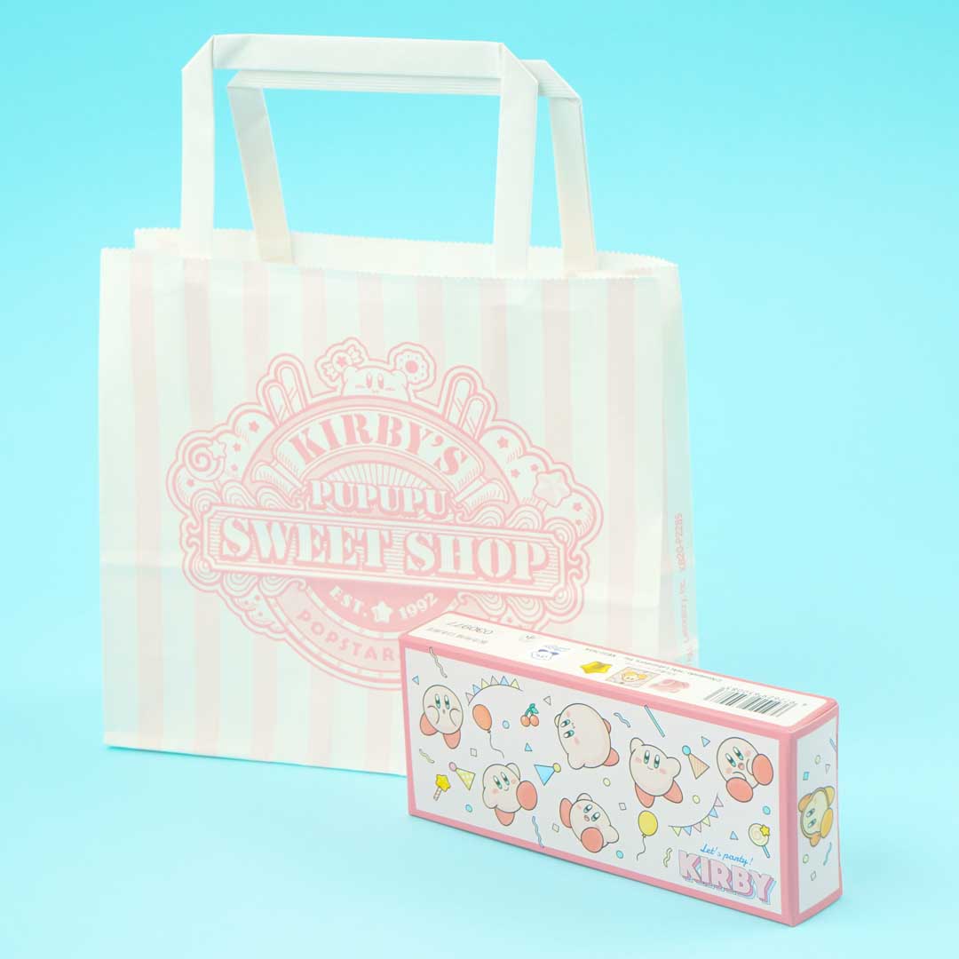 Gift your special someone with this box of mini chocolates! It’s decorated with cute prints of Kirby and contains three shapes of mini chocolates. The paper bag that comes with the set has kawaii pink and white stripes.