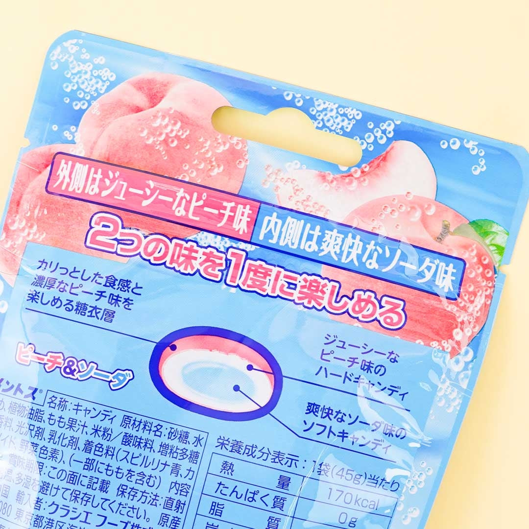 A limited edition pack of peach-flavored sugar shell candy with soda soft candy filling