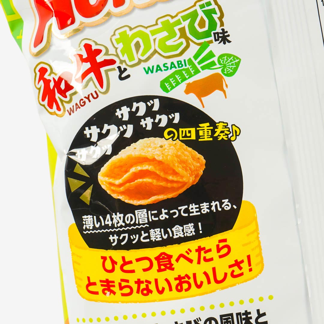 Taste the savory combination of Wagyu beef and Japanese wasabi in this corn snack! Each bite of this crispy, four-layered chip delivers a satisfying crunch and a balance of rich umami with a refreshing wasabi kick. Enjoy it anytime you're craving something exciting!