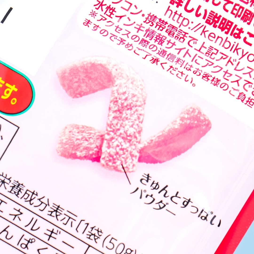 • A resealable pack of fettuccine noodle-shaped gummy candies with Amaou strawberry fruit juice