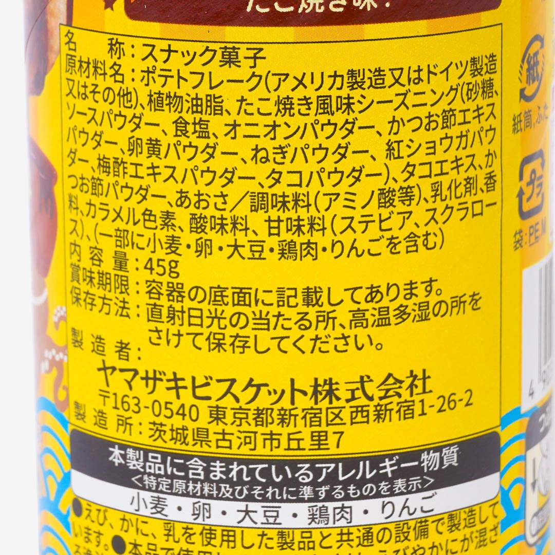 Enjoy the crispy crunch of these potato chips with a tasty takoyaki flavor! They're packed in a handy tube, so it's perfect for snacking on the go.