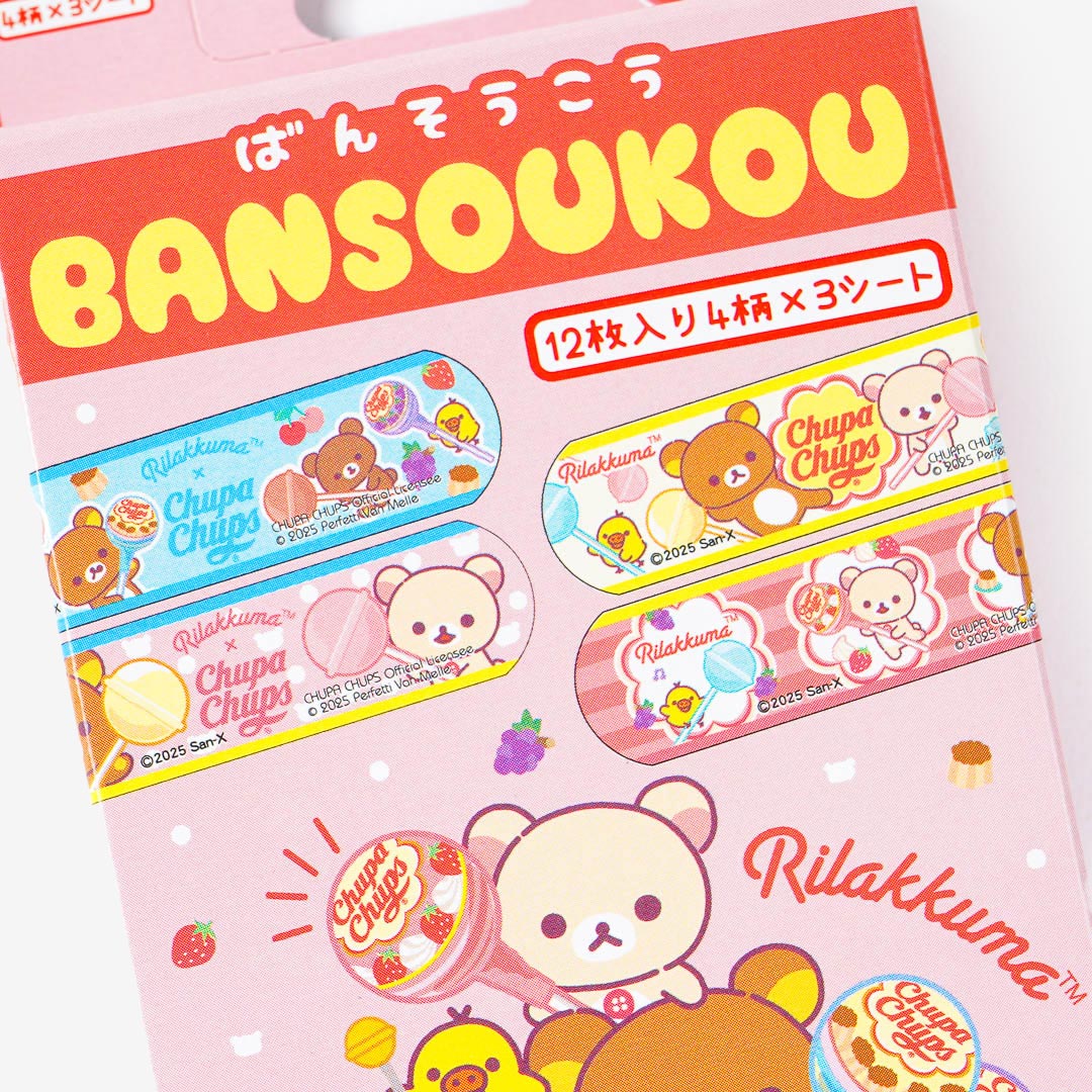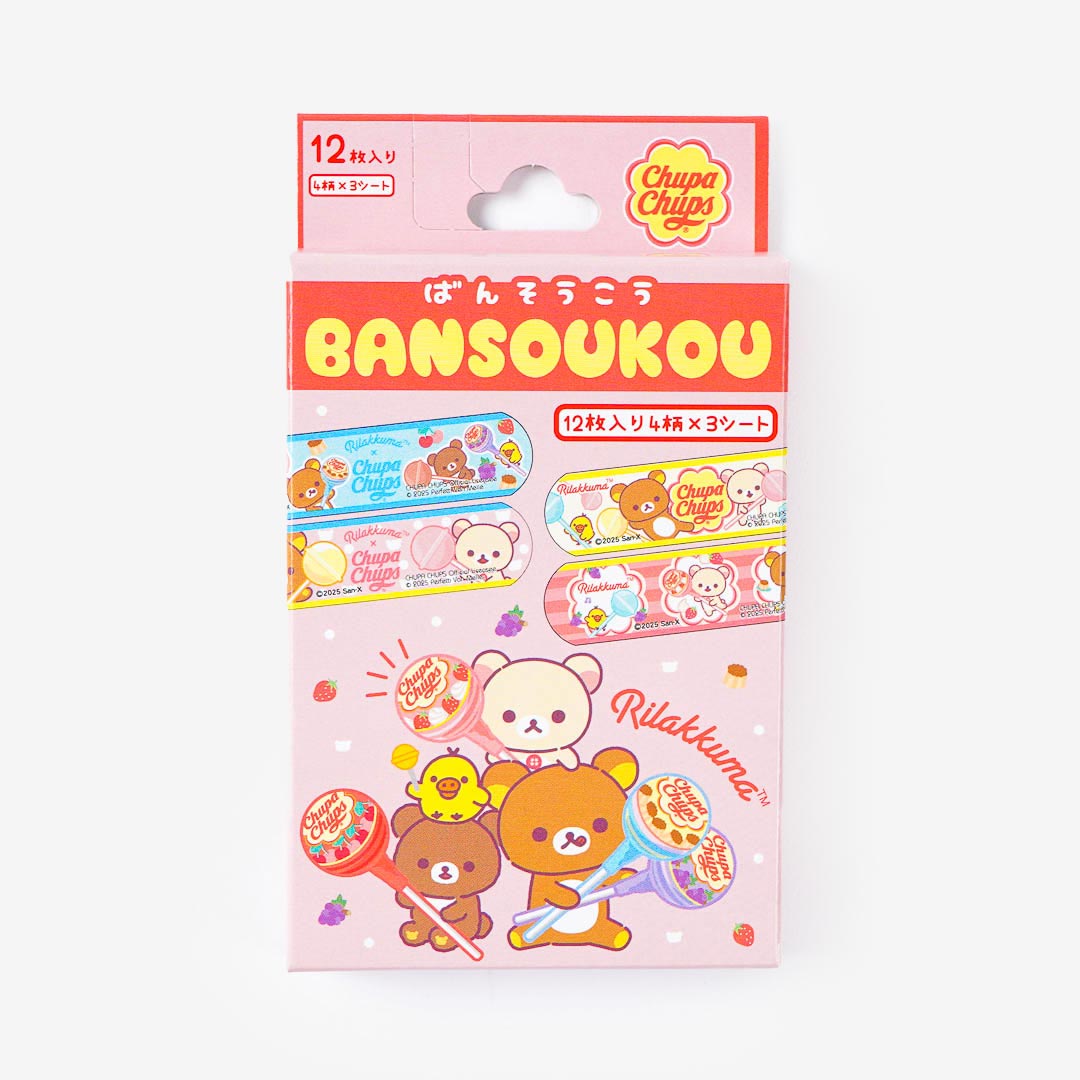 Keep your wounds dressed with the help of this box of cute bandages! It comes from a collab between San-X and Chupa Chups. These bandages feature prints of Rilakkuma and his friends carrying giant Chupa Chups lollipops.