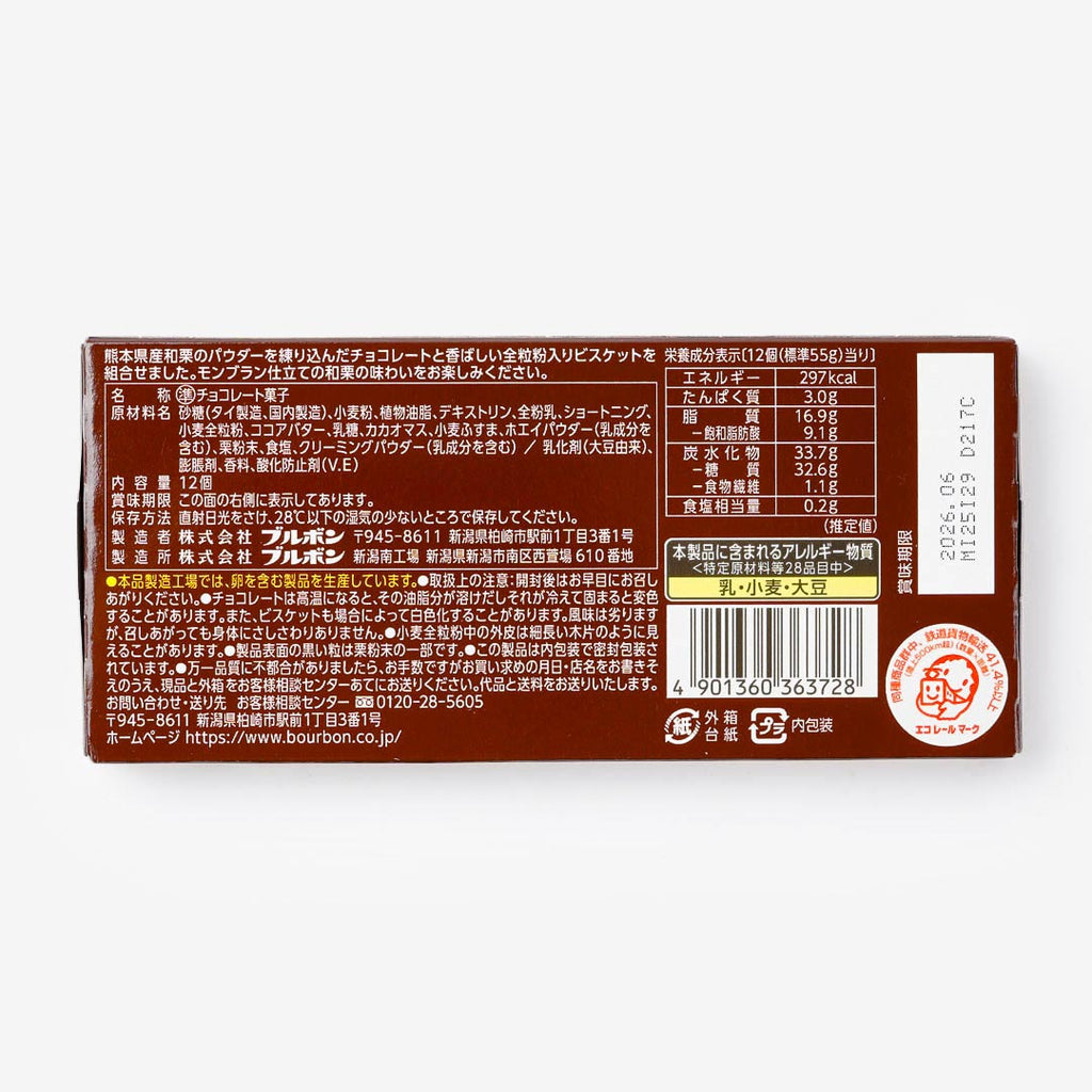 Enjoy the fragrant and elegant taste of Japanese chestnuts in these limited-edition mini chocolate biscuits! It uses Japanese chestnut powder from Kumamoto, giving each piece a sweet and nutty Mont Blanc taste.