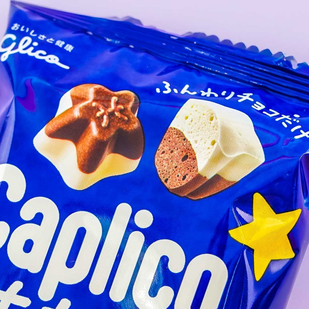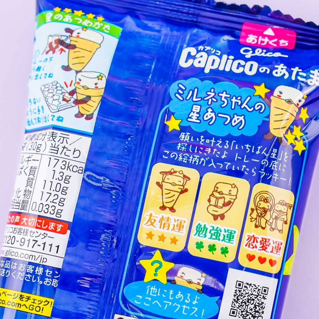 Caplico is usually offered in an ice cream cone shape but now Glico has turned the amazing chocolate snack into small star-shaped chocolates! These delicious sweets are made of bubble chocolate, milk, and white chocolate. The pack includes 12 bubble chocolate stars. What makes Caplico unique is that you can use the package to read your fortune! Super fun and super delicious!