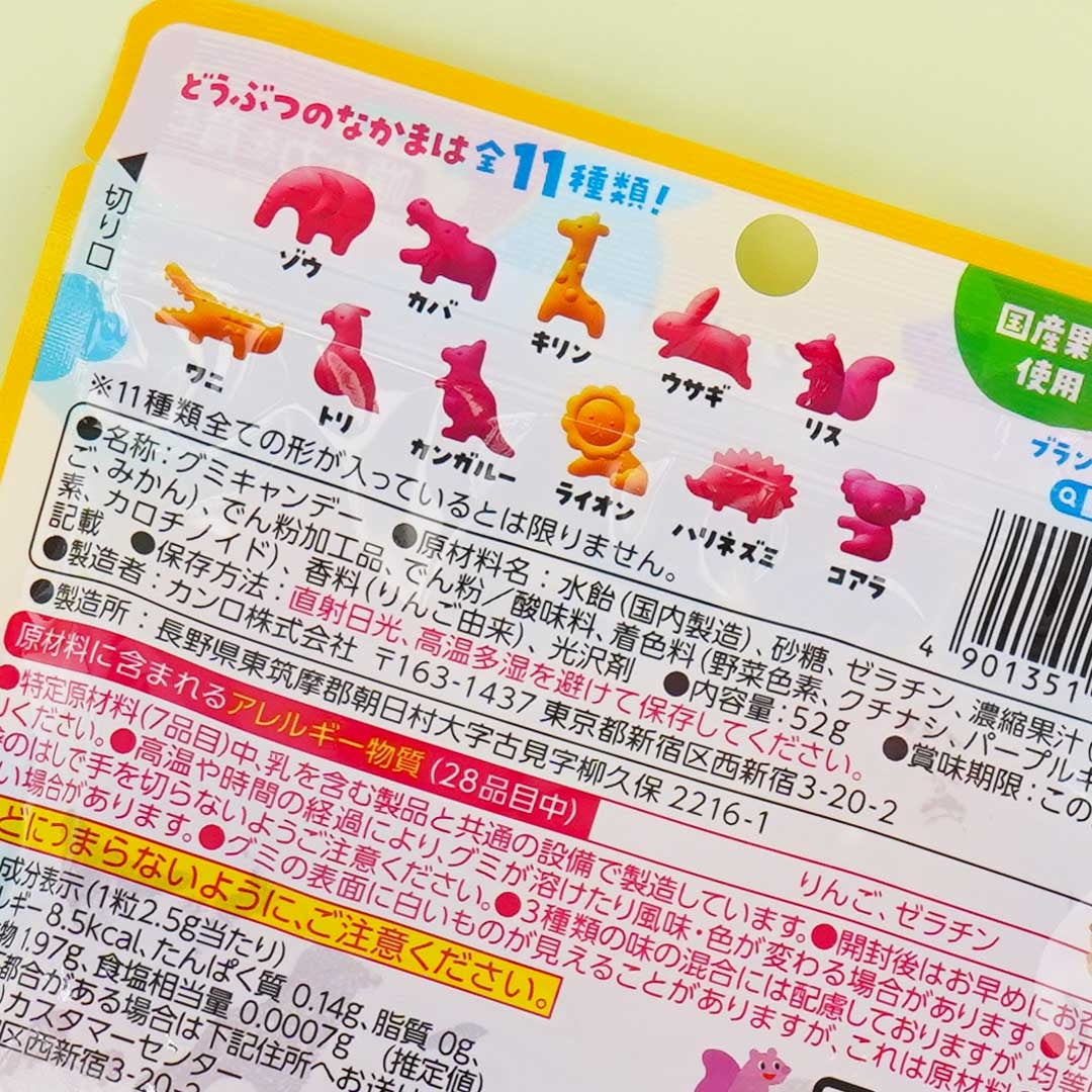 A pack of animal-shaped gummies in orange, strawberry, and grape flavors