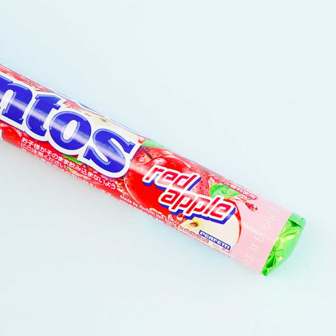 A stick pack of red apple-flavored sugar shell candies with soft red apple candy filling