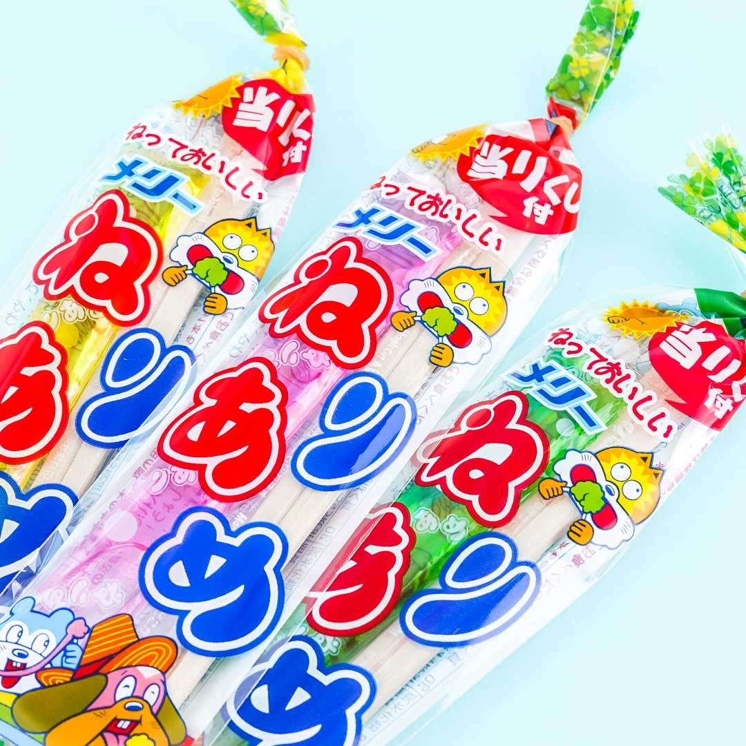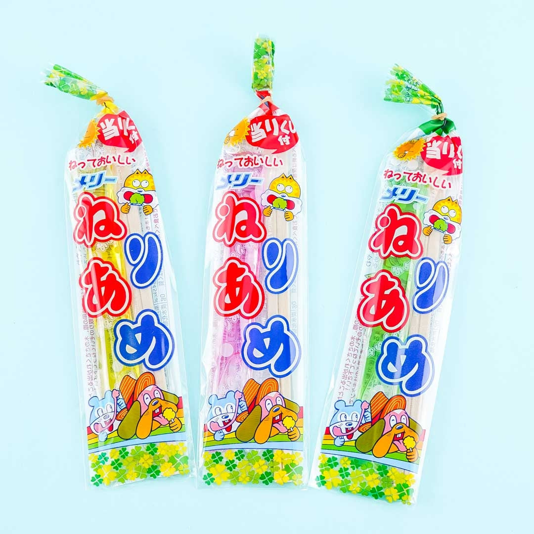 Neri Ame or Mizu Ame candies are water-like sugar creations that are popular dagashi or affordable Japanese sweets that are usually sold during festivals! Stretch and shape this fruity treat anyway you want to by using the included pair of chopsticks! Youll receive a random-colored sticky candy when you order!