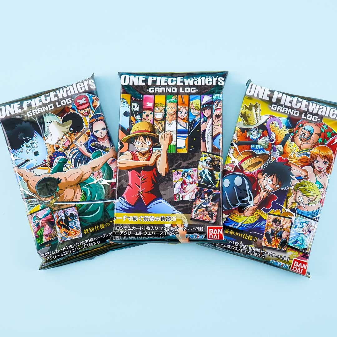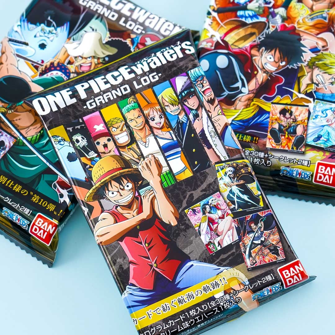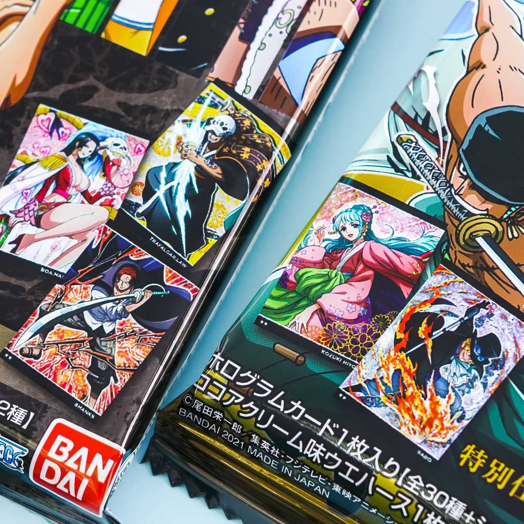 Add this One Piece card to your collection of anime merchandise! It comes with a cocoa cream wafer that you can snack on. This card was randomly selected from a set of 30 regular designs and 2 secret designs featuring One Piece characters. You'll receive one random package design when you order.