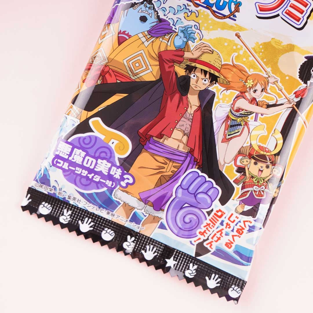 A pack of fruit cider-flavored gummy candy decorated with prints of One Piece characters