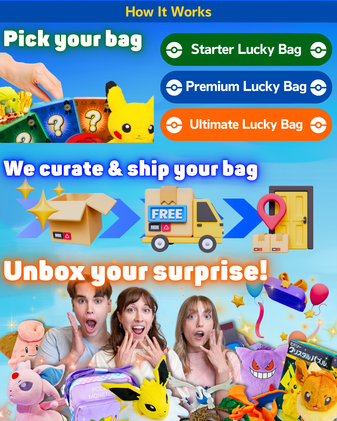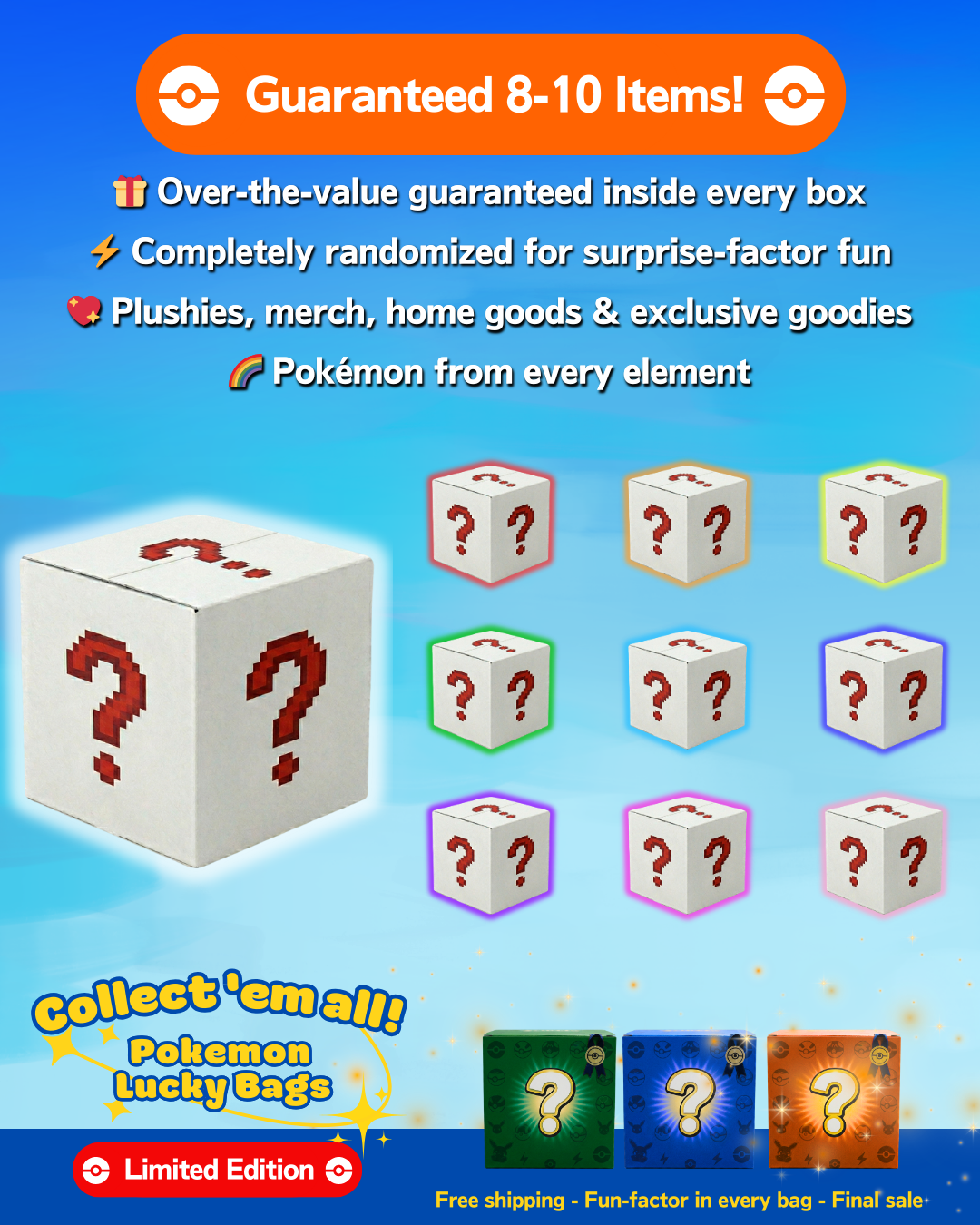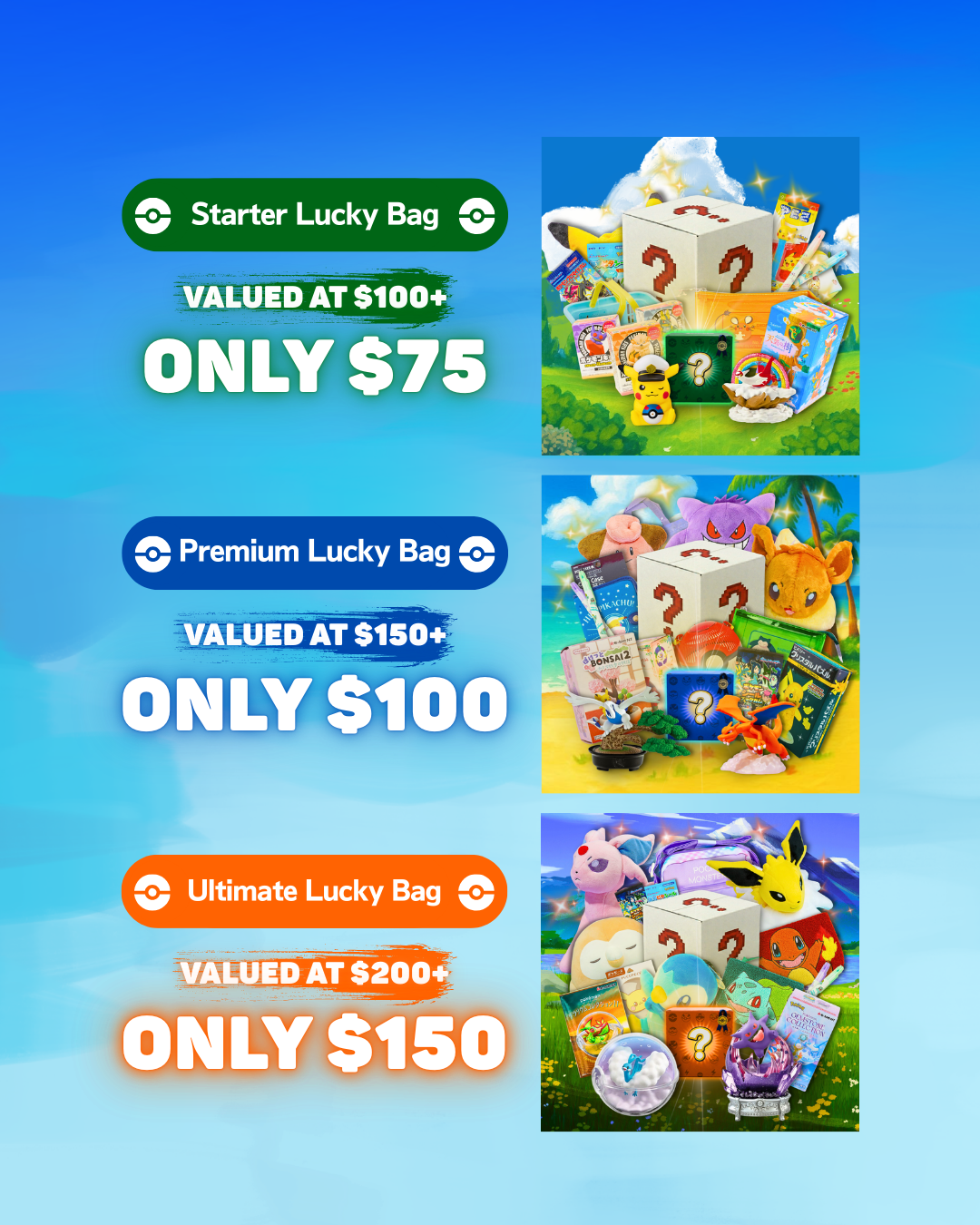 Whether youre a long-time collector or looking for the perfect surprise gift for loved ones, friends and more, our Lucky Bags deliver the fun, mystery and adventure of the Pokémon world straight to your door. Weve hand-picked a balanced mix of high-quality items to ensure every box is a win.