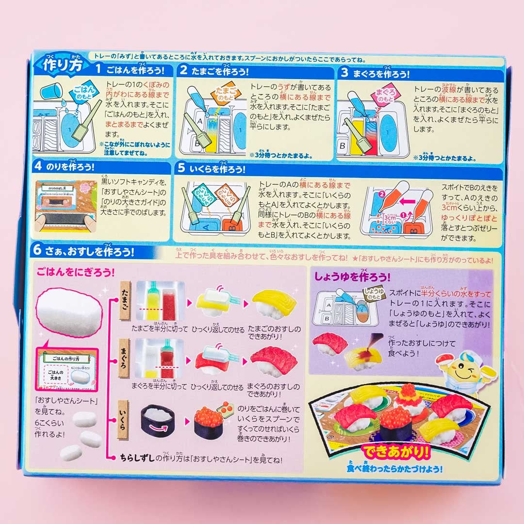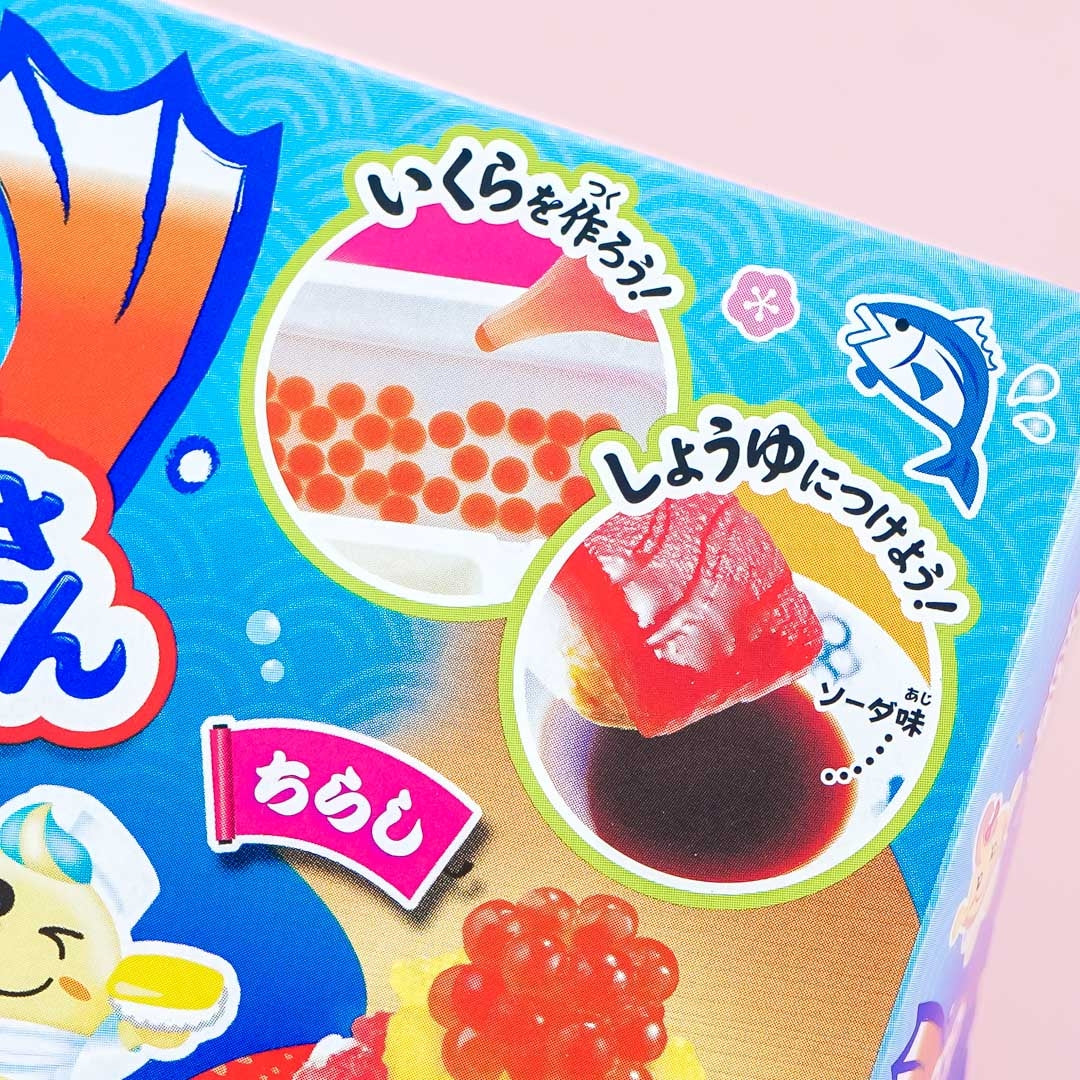 This do-it-yourself set teaches you how to make candy sushi! By mixing water and the included ingredients, you can stir, mold and knead this kit into delicious candy sushi! Tonight on the menu we have egg rolls, salmon roe, tuna and chirashi sushi - all made by you! This sushi set is great fun for children and adults alike. Furthermore, it contains no preservatives or synthesized colorings. Popin' Cookin' sets are a fun and interesting way to make your own sweets and have a great time together with your family and friends!